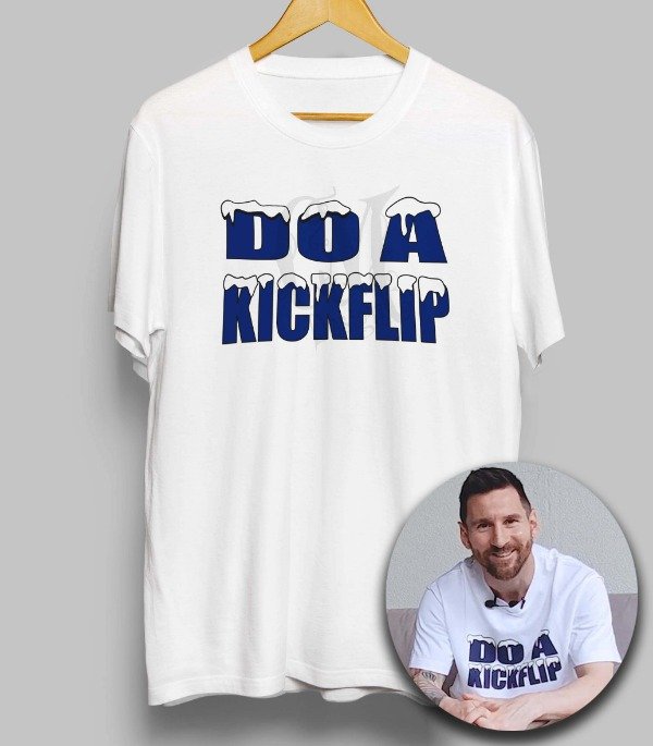 Remera modelo unisex, reproducción exclusiva de remera de LV, "Do a kickflip" usada x Messi. Estampa en frente y espalda